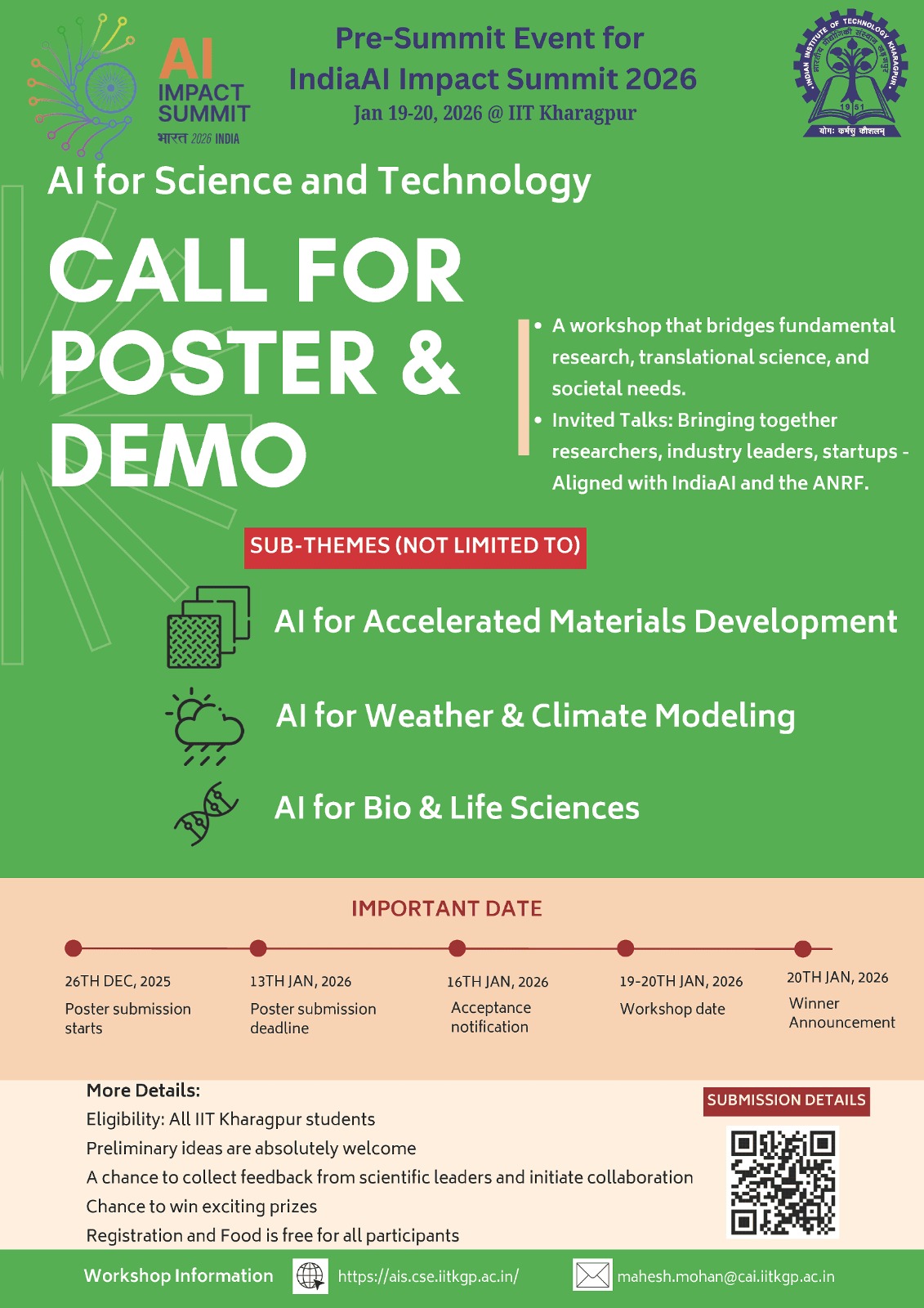 The IndiaAI AI Impact Summit is bringing together researchers, industry leaders, startups, and students at an unprecedented scale to accelerate the nation’s AI-driven innovation ecosystem. As part of the pre-summit activities, IIT Kharagpur is uniquely positioned to host a workshop that bridges fundamental research, translational science, and societal needs. With its long legacy in engineering science, computational research, and interdisciplinary problem-solving, IIT Kharagpur provides a fertile environment for catalyzing national efforts aligned with IndiaAI and the ANRF. With advanced HPC infrastructure, leading centers in AI, materials science, biosciences, and atmospheric sciences, a vibrant community of researchers collaborating across disciplines and the brightest students in India; it is a natural hub for shaping India’s AI agenda.
